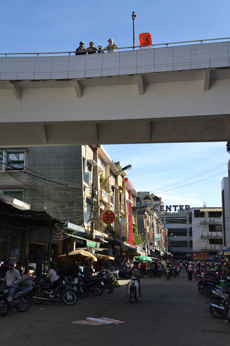 Các tiểu thương cho biết, khi họ đang buôn bán thì bất ngờ thấy một người rơi từ trên cầu, bắc từ khu Hòa Bình qua chợ lầu Đà Lạt. Độ cao từ thành cầu xuống đường hơn 10 m.