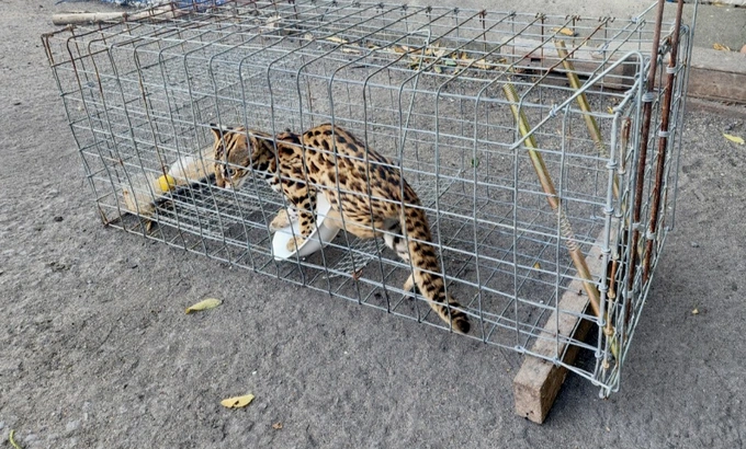 Theo ông Điệp, gia đình có nuôi một đàn gà. Thời gian gần đây, số lượng gà bỗng nhiên bị mất hơn 10 con. Thấy vậy, ông Điệp đặt một cái bẫy gần khu vực chuồng gà để tìm nguyên nhân và bắt được một con vật trông giống mèo.