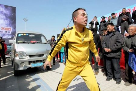 Trước sự chứng kiến và cổ vũ của nhiểu người, anh Zhang Yilong đã dùng một sợi dây buộc vào chiếc xe hơi, sau đó dùng hai móc để móc vào lỗ mũi rồi vận công kéo chiếc xe chuyển động.