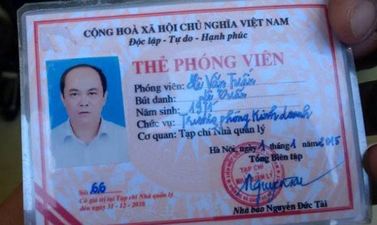 Tại phòng bảo vệ, người đàn ông trong tình trạng thiếu kiểm soát, có hơi men đã xưng mình là “nhà báo” đang vào làm việc với lãnh đạo rồi rút trong ví ra một thẻ phóng viên ghi Lê Văn Tuấn (SN 1971, bút danh Lê Tuấn), chức vụ là Trưởng phòng kinh doanh, được cấp ngày 1/1/2015 và ngày hết hạn sử dụng là ngày 31/12/2018. Người cấp thẻ trên là nhà báo Nguyễn Đức Tài, Tổng biên tập Tạp chí Nhà quản lý.