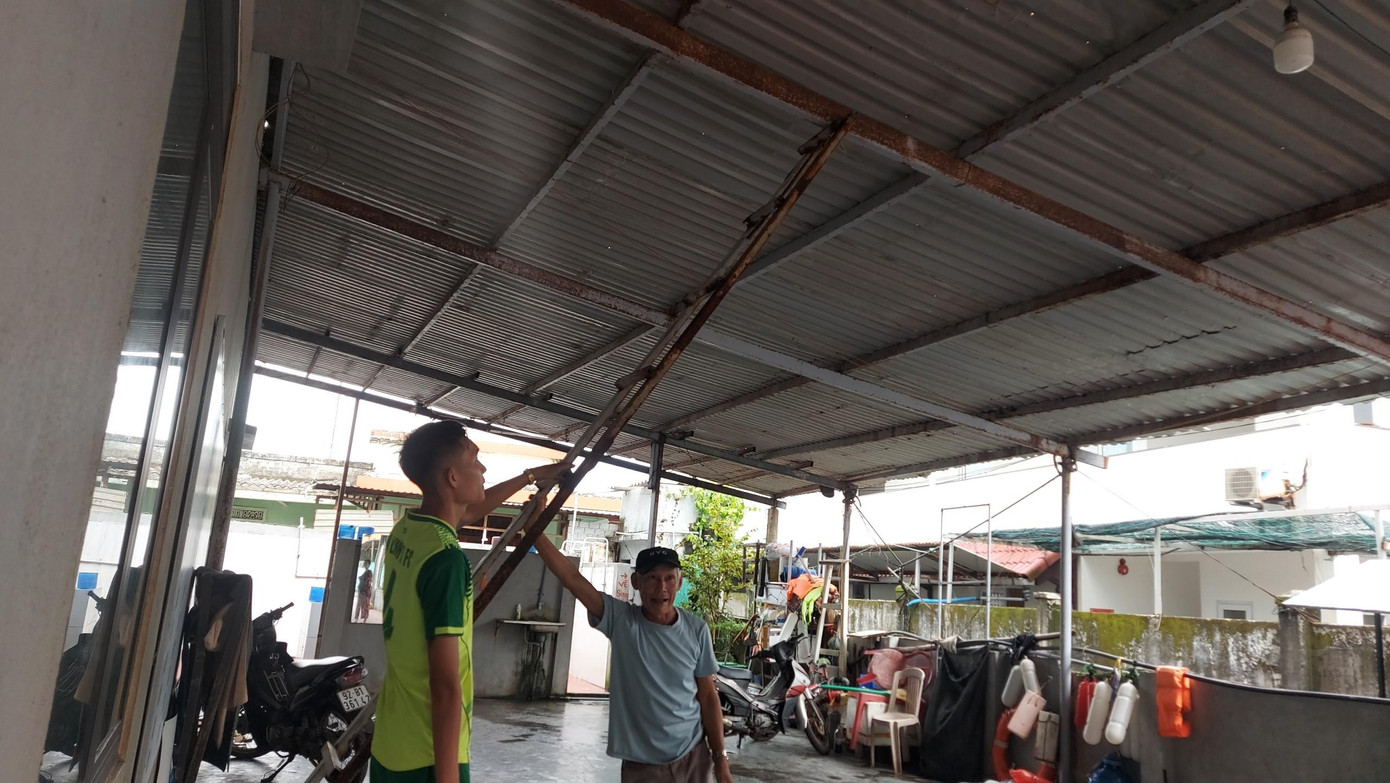 | Các bao cát hoặc bao bóng đựng nước được đặt lên mái tôn đề phòng bị bão thổi bay |