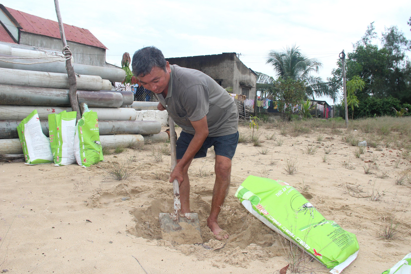 Nhà nằm gần biển, nên mỗi khi nghe tin bão thì ông Trần Văn Thu ở thôn Hòa Thượng, xã Tam Thanh, TP. Tam Kỳ đều lo phương án bảo vệ bản thân và tài sản. “Nghe nói bão này mạnh lắm tui cũng đâm lo. Con cái đi làm, nhà còn có một mình nên cứ lo làm trước cho yên tâm. Tui xúc cát để đây, ngày mai con nó về tới thì chỉ việc đưa lên”, ông Thu nói.