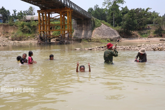 Tại đoạn sông Trường chảy qua xã Phước Hiệp (huyện Phước Sơn), giữa cái nắng ban trưa như thiêu như đốt, hơn chục người dân gồm cả trẻ nhỏ trầm mình dưới dòng nước đục ngầu.
