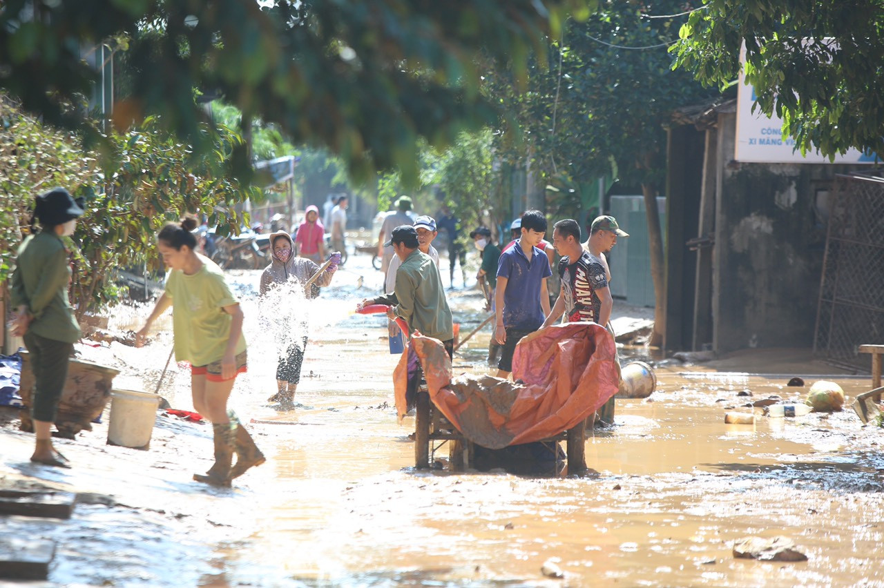 Rác thải trôi ngập, vật dụng hư hỏng, người dân tất bật dọn dẹp.