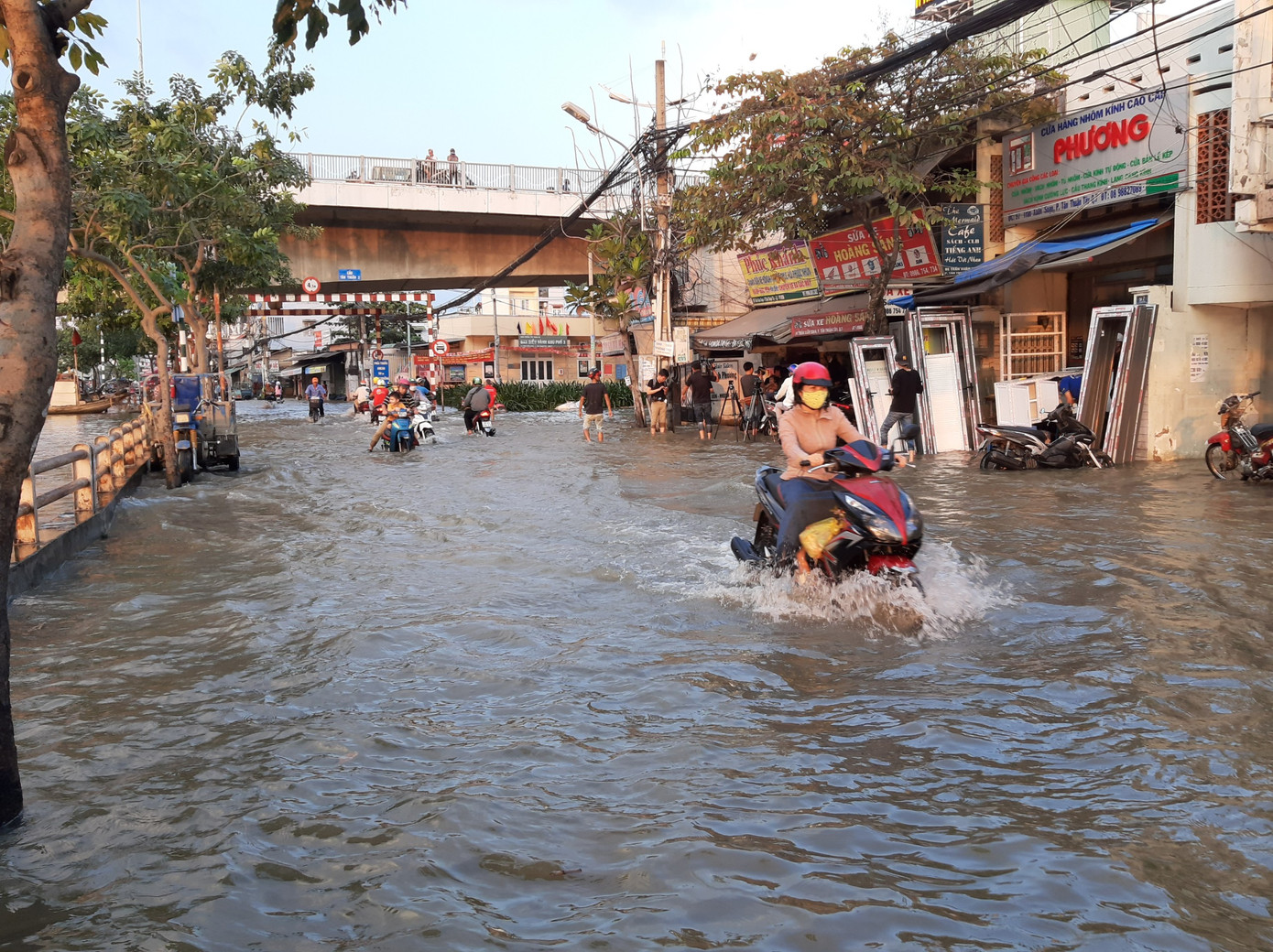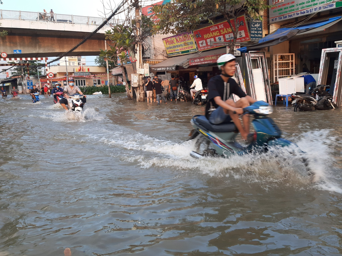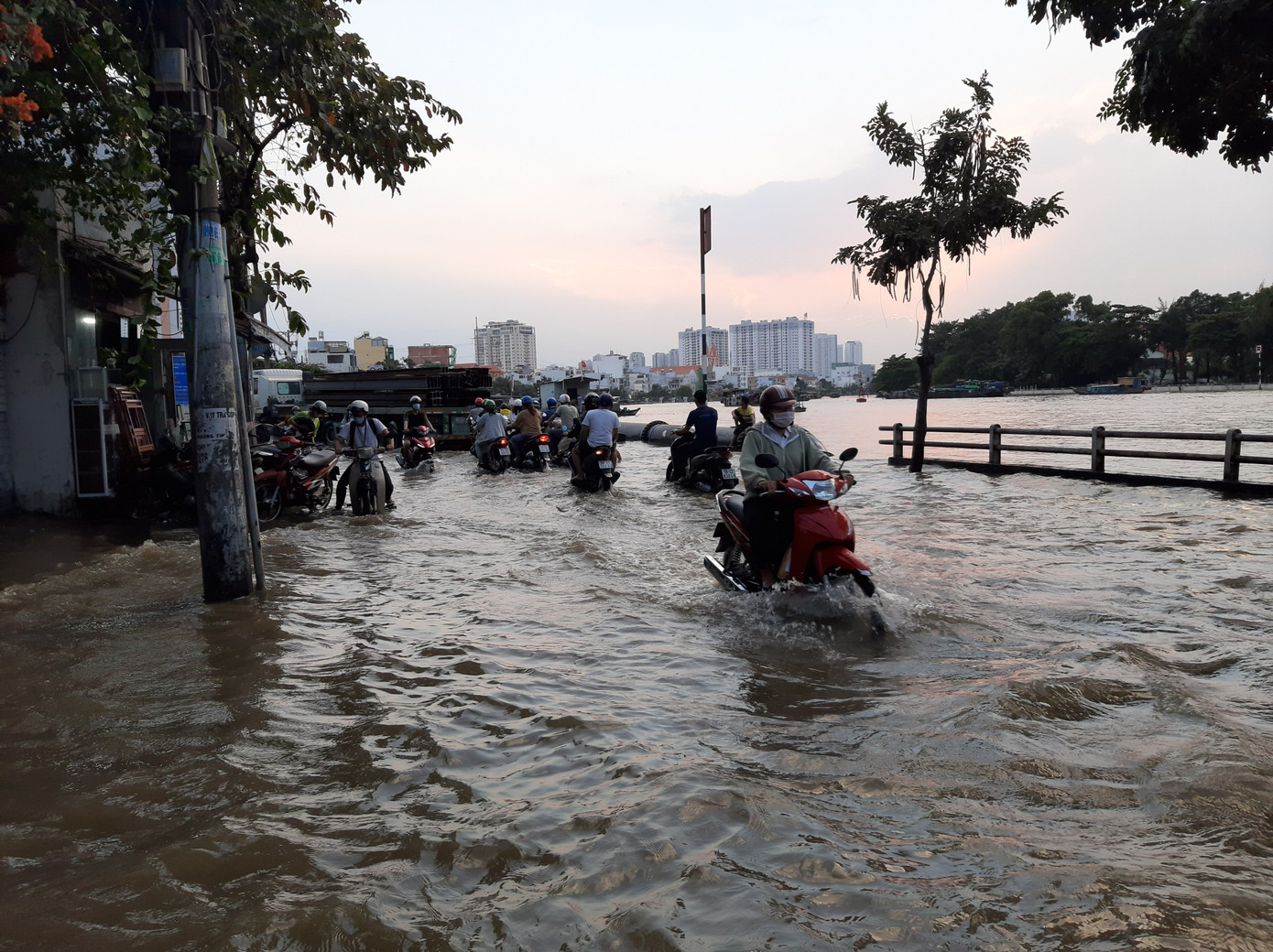 Dù đỉnh triều vào buổi chiều không cao bằng lúc sáng sớm nhưng cũng khiến nhiều khu vực ở TPHCM ngập nặng do nước tràn từ ngoài sông lên đường.