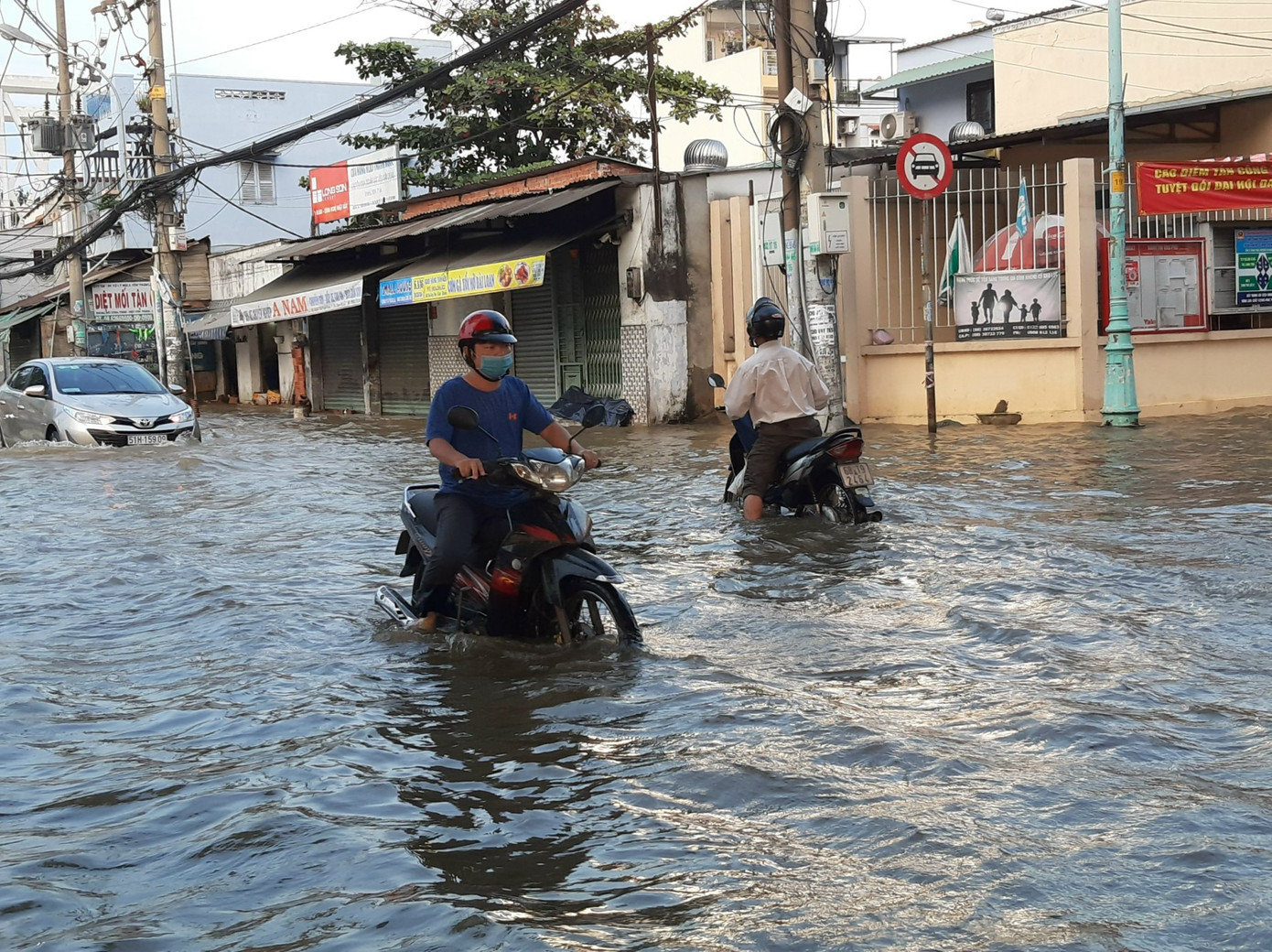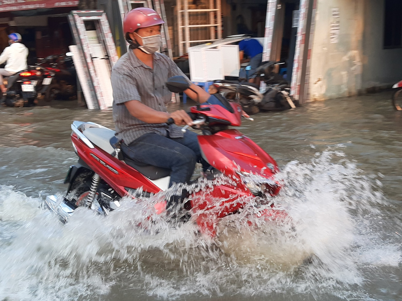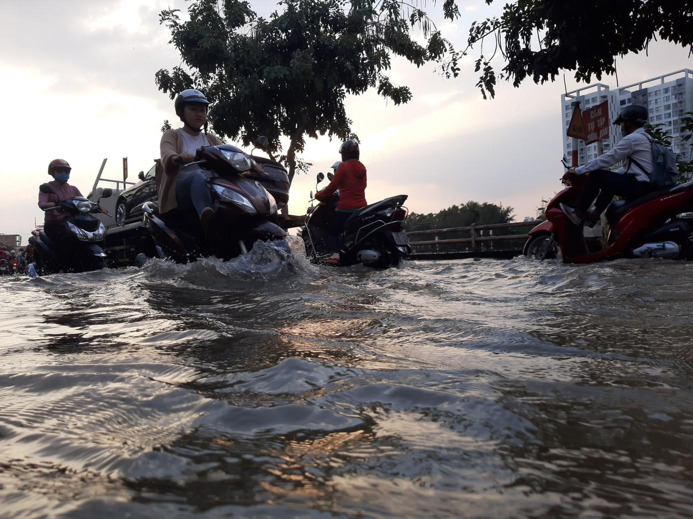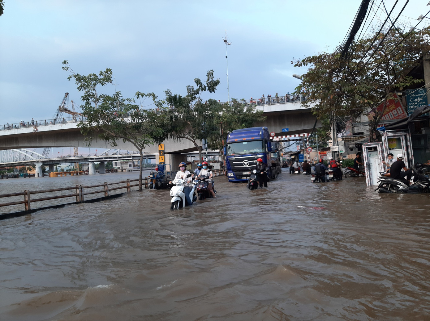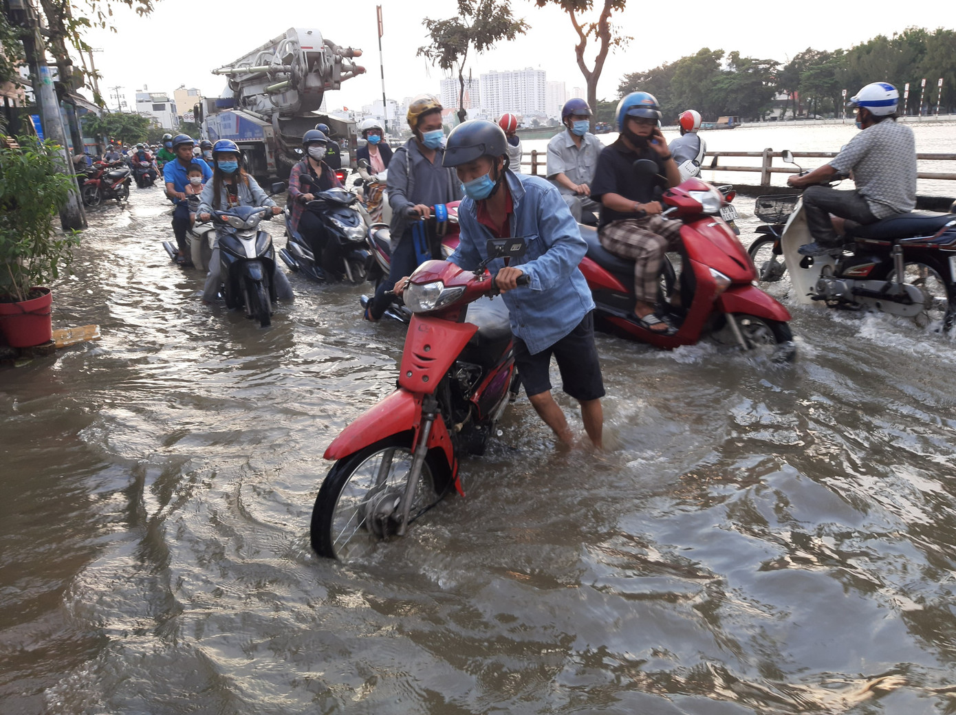 Ghi nhận tại các tuyến đường như Trần Xuân Soạn (quận 7), Tôn Thất Thuyết (quận 4), Nguyễn Văn Hưởng (quận 2)… nước ngập gần lút bánh xe máy khiến giao thông gặp nhiều khó khăn.