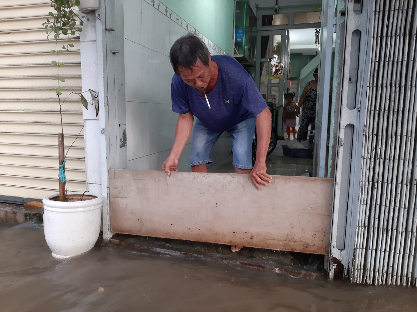 Từ chiều tối, nhiều hộ dân trên các tuyến đường thường ngập do triều đã chuẩn bị che chắn để ngăn nước tràn vào nhà.