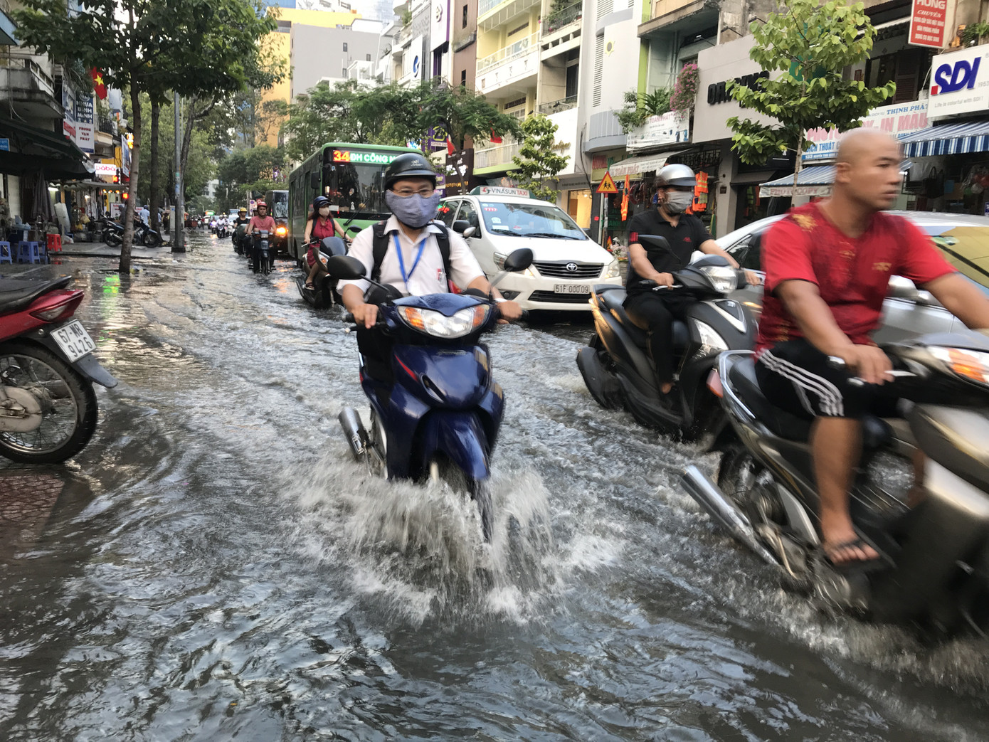 Tại khu vực quận 1, TPHCM, nước tràn lên đường gây ngập nặng khiến giao thông gặp nhiều khó khăn.