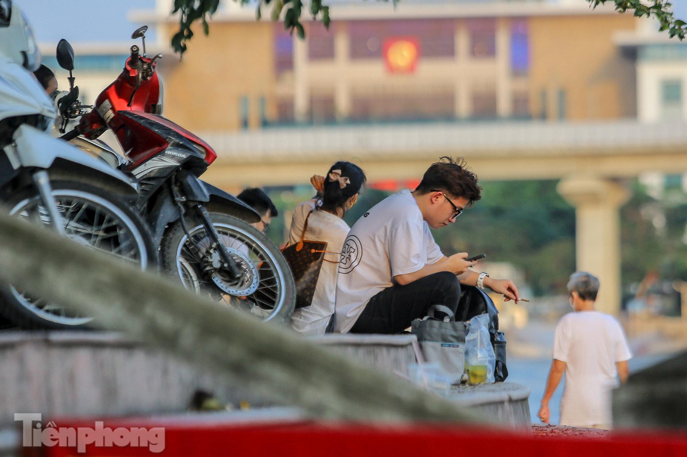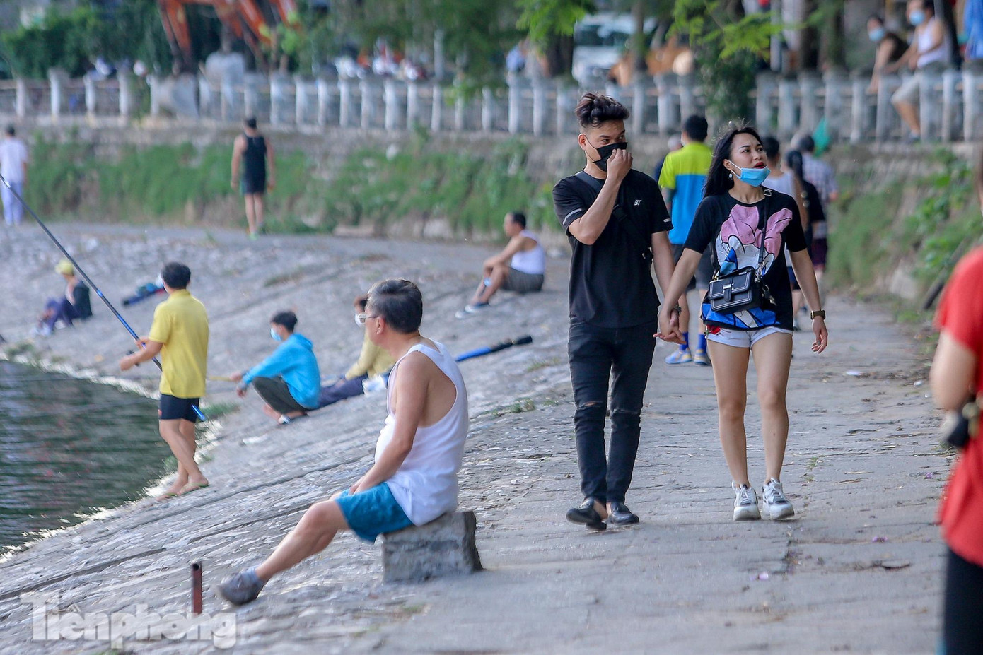 Dù lực lượng chức năng đã dựng rào chắn chặn các lối xuống tuy nhiên người dân vẫn thản nhiên tụ tập, túm 5 tụm 3 ngồi hóng mát, tập thể dục, câu cá tại đường ven hồ, không ít người dân vẫn thoải mái giao tiếp ở cự ly gần.