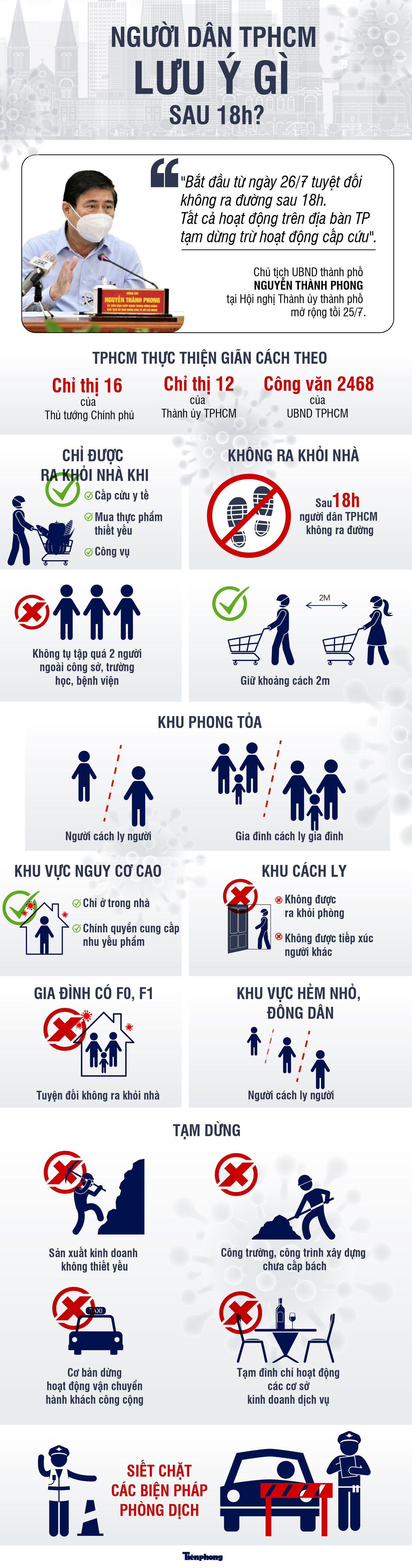 TPO - "Sau18 giờ người dân TPHCM không ra đường" là quyết định được Chủ tịch UBND thành phố Nguyễn Thành Phong đưa ra tại Hội nghị Thành ủy thành phố mở rộng tối 25/7 để tăng cường các biện pháp phòng, chống dịch trong bối cảnh TP HCM ghi nhận hơn 58.000 ca nhiễm trong đợt bùng phát dịch thứ tư.