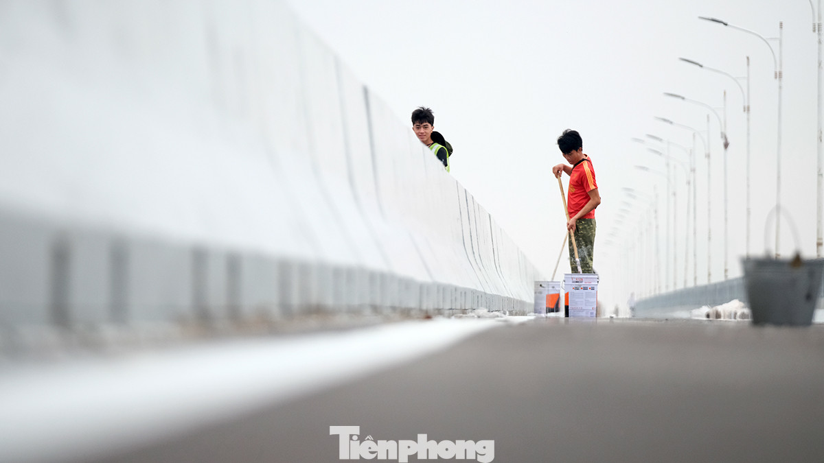 Công nhân đang quét sơn dải phân cách và vệ sinh bề mặt cầu. Những công việc được coi là cuối cùng trước khi dự án được đưa vào sử dụng.