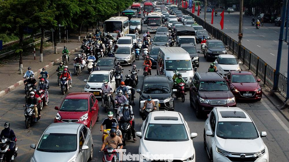 | Kỳ nghỉ lễ năm nay, nhiều người dân tranh thủ về quê và đi du lịch khiến lượng phương tiện giao thông tại các cửa ngõ Thủ đô tăng cao đột biến. |