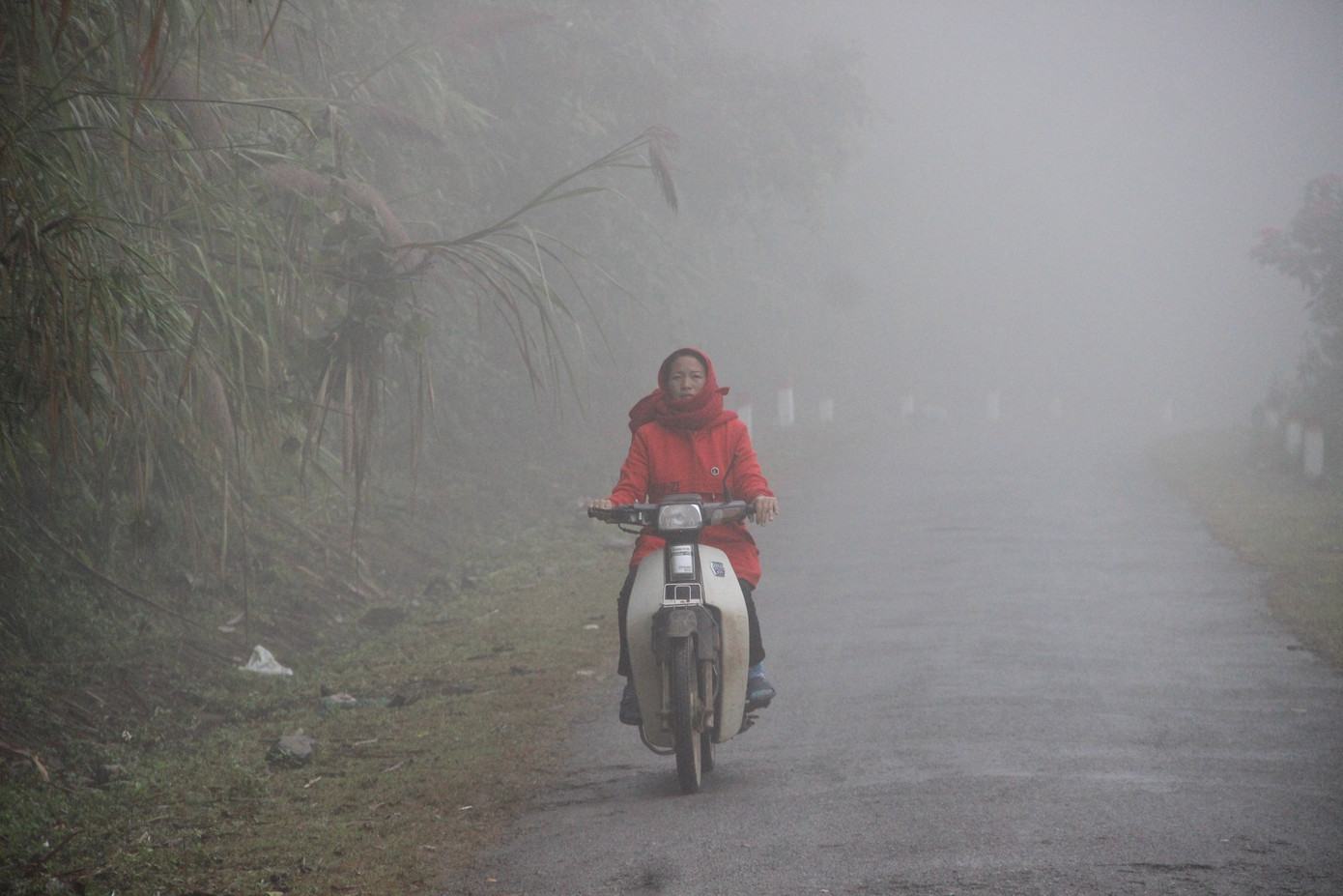 Tại một số tuyến đường ở miền núi Nghệ An vắng người qua lại, còn những người tham gia giao thông thì dùng khẩu trang, tất tay chống rét.