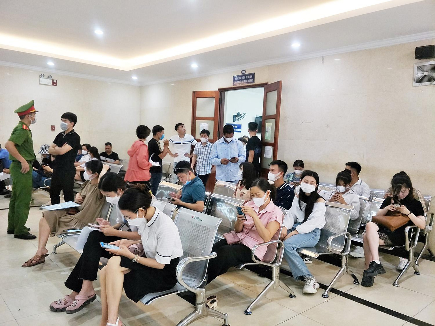 Từ khu vực hành lang bên ngoài vào trong phòng tiếp nhận hồ sơ, tất cả các ghế ngồi đều kín chỗ, một số người phải đứng ở ngoài chờ đợi đến lượt.