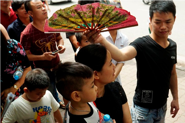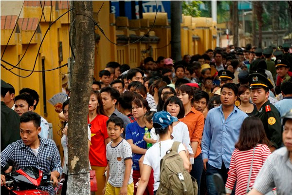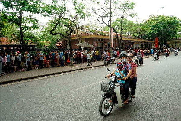 Thời tiết Hà Nội sáng 1/5 khá mát mẻ giúp người dân xếp hàng đỡ vất vả hơn.