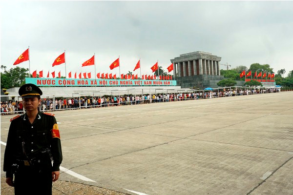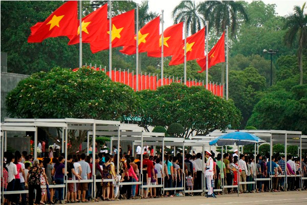 Dòng người chờ vao viếng Bác dưới hàng cờ đỏ sao vàng tung bay trên khán đài.