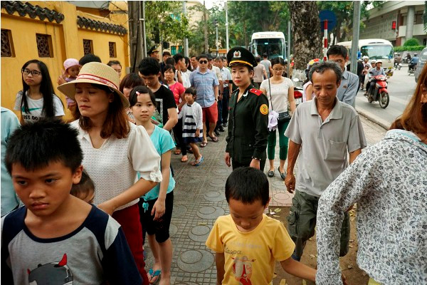 Dòng người xếp hàng vào viếng lăng Bác kéo dài từ đoạn ngã tư đường Hùng Vương - Lê Hồng Phong đến phố Ngọc Hà.