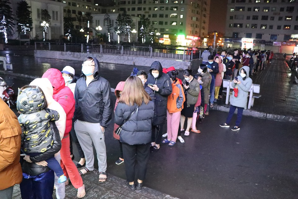 Đêm ngày 5/2, rất nhiều người dân chung cư HH Linh Đàm, phường Hoàng Liệt (quận Hoàng Mai, Hà Nội) đội mưa rét xếp hàng trước một cửa hàng thuốc để mua hộp khẩu trang bán đúng giá.
