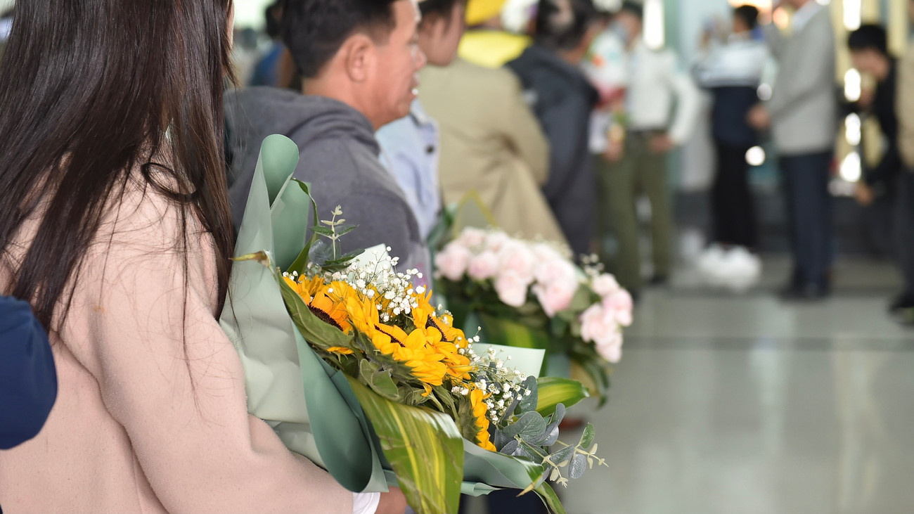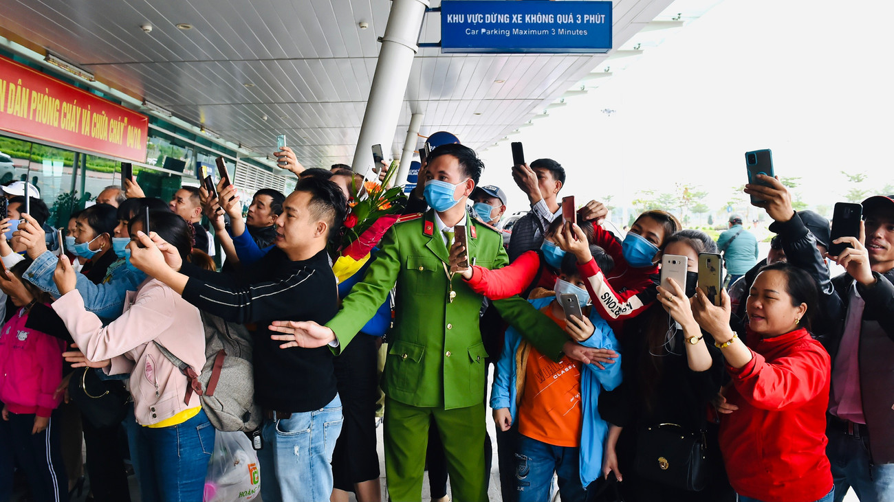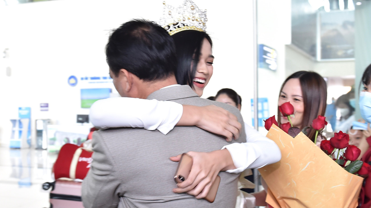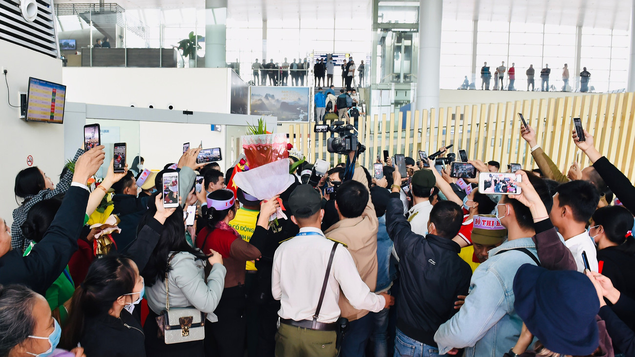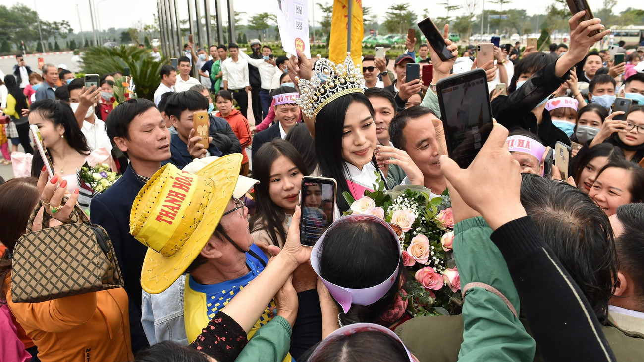Người thân, bạn bè, người dân vây quanh để tặng hoa, chụp ảnh lưu niệm và livestream khi Hoa hậu Đỗ Thị Hà vừa xuống sân bay.