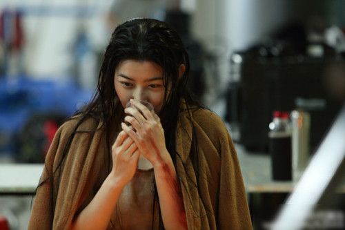 Hạo Hạo uống nước ấm sau một cảnh bơi lội trên trường quay.