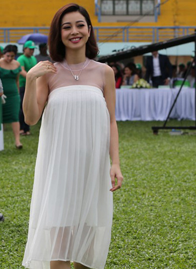 Hoa hậu Jennifer Phạm giấu bụng bầu trong váy suông rộng.