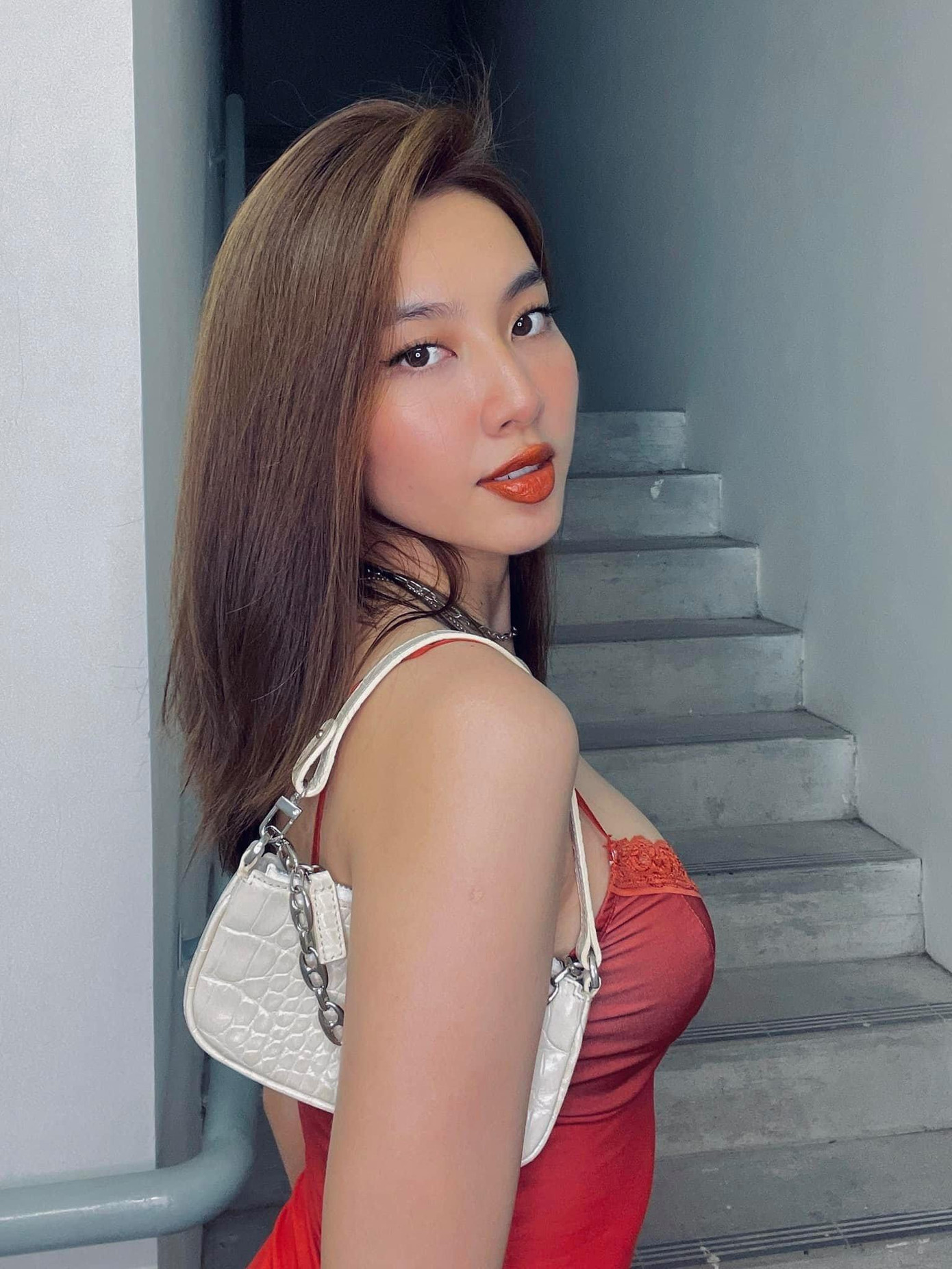 | Người đẹp Nhân ái Thuỳ Tiên diện váy hai dây bó sát tông màu đỏ nổi bật, khoe vòng một quyến rũ. |