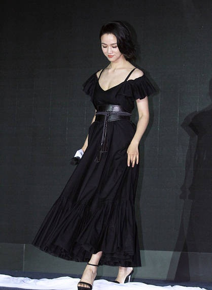 Trong sự kiện hôm qua 7/6, người đẹp phim "Sắc, giới" diện đầm đen hai dây có phần cổ trễ nải siêu gợi cảm.