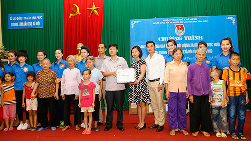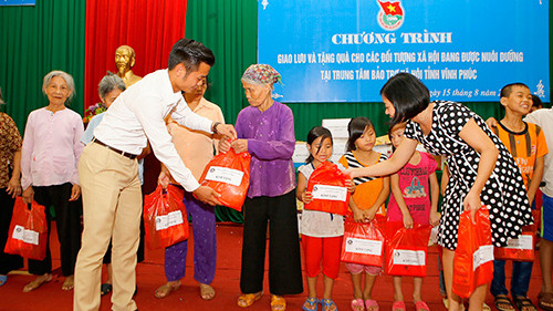 TPO - Chiều 15/8 tại Trung tâm Bảo trợ xã hội tỉnh Vĩnh Phúc, tỉnh Đoàn thanh niên Vĩnh Phúc, phối hợp với công ty cổ phần Lạc Hồng tổ chức chương trình Giao lưu và tặng quà cho các đối tượng là người già không nơi nương tựa và trẻ em mồ côi đang được nuôi dưỡng tại Trung tâm.