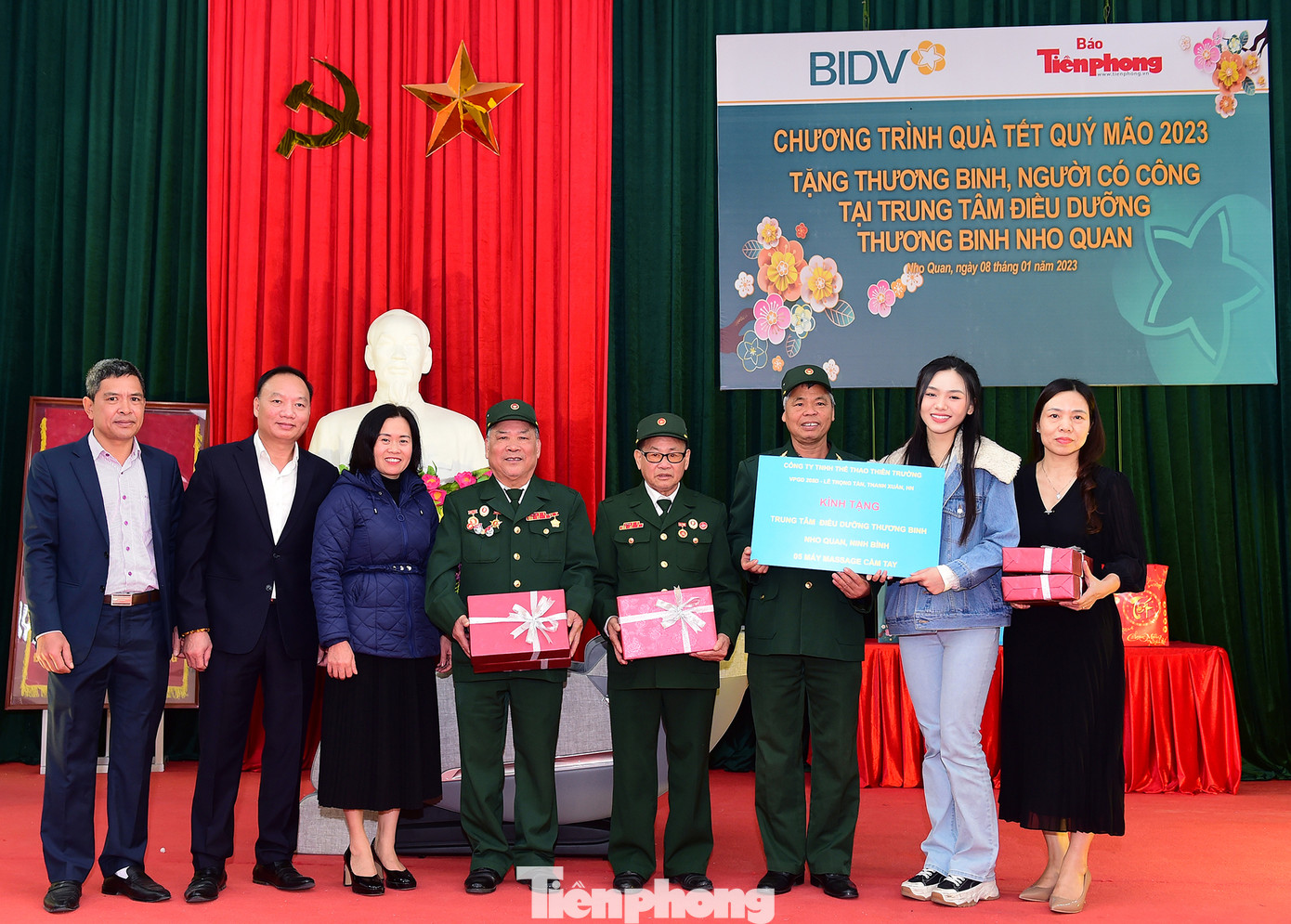 Trong dịp Tết đến Xuân về, người đẹp Đinh Khánh Hòa - Top 10 cuộc thi Hoa hậu Việt Nam năm 2022 thăm, chúc Tết và tặng quà gồm 1 ghế massage toàn thân và 10 phần quà với tổng trị giá 50 triệu đồng tới thương bệnh binh đang được chăm sóc, điều trị tại trung tâm điều dưỡng Nho Quan.