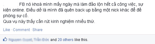 Vài tuần qua, rất nhiều người bất ngờ bị khóa tài khoản tạm thời và bắt buộc phải đổi tên, nếu không họ sẽ mất tài khoản vĩnh viễn. "Facebook khoá mấy ngày mà làm đảo lộn hết cả công việc, sự kiện online. Điều dở là mình quên tạo một nick khác để đề phòng sự cố. Qua vụ này thấy cần rút kinh nghiệm nhiều thứ", thành viên Cao Mạnh Tuấn chia sẻ.