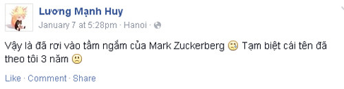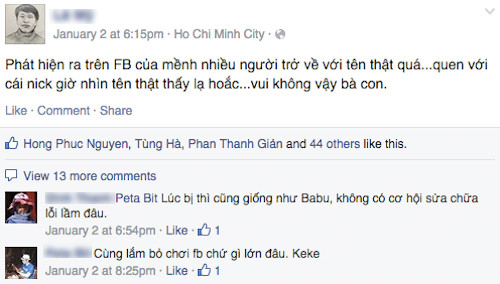 "Bởi thứ người ta nhận ra nhau ở chốn này (mạng xã hội) không phải tên thật mà là thứ gì đó người ta đã quen. Facebook nói tên thực giúp 'bạn bè biết họ đang kết nối với ai', nhưng tôi lại thấy lúc tôi để tên thật mới chính là lúc chẳng ai nhận ra tôi á", thành viên Ngô Thiên Chương, nổi tiếng với biệt danh Trueman VN, bức xúc viết trên status.