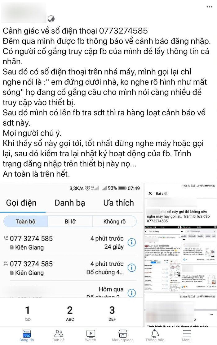 “Mọi người chú ý, nếu ai nhận được cuộc gọi từ số 0773274585 thì đừng nhấc máy nhé. Ban đầu họ sẽ nháy máy để mình gọi lại, đến khi mình gọi thì toàn nghe thấy họ nói gì không rõ. Họ cố tình để mình gọi, câu giờ để lấy hết thông tin của mình. Những ai đăng ký tài khoản ngân hàng thì nên cẩn thận vì có thể họ sẽ lấy cắp thông tin”, một bài đăng cảnh báo cho biết.