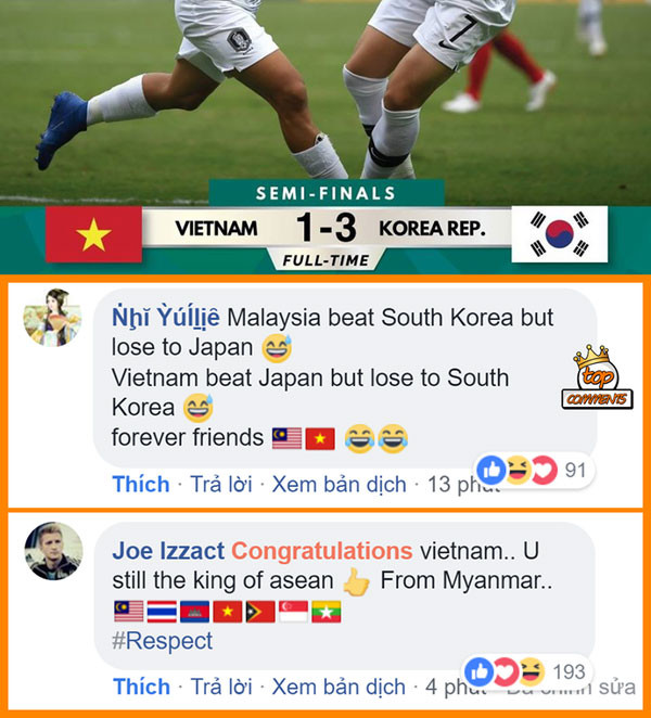 Không chỉ Việt Nam, Olympic Việt Nam còn nhận được nhiều lời chia buồn từ bạn bè Đông Nam Á. Không ít bình luận cũng tỏ ra tự hào vì đại diện khu vực. Ảnh: Top Comments.