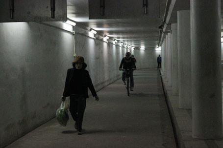 Có mặt tại hầm đường bộ nút giao thông Ngã Tư Sở (Đống Đa - Hà Nội), theo ghi nhận của PV Dân trí, lúc 6h15 có rất nhiều người dân đi bộ, đạp xe tập thể dục tại đây. Khi được hỏi, số đông đều cho rằng tập thể dục dưới hầm đường bộ để tránh mưa rét và an toàn hơn.