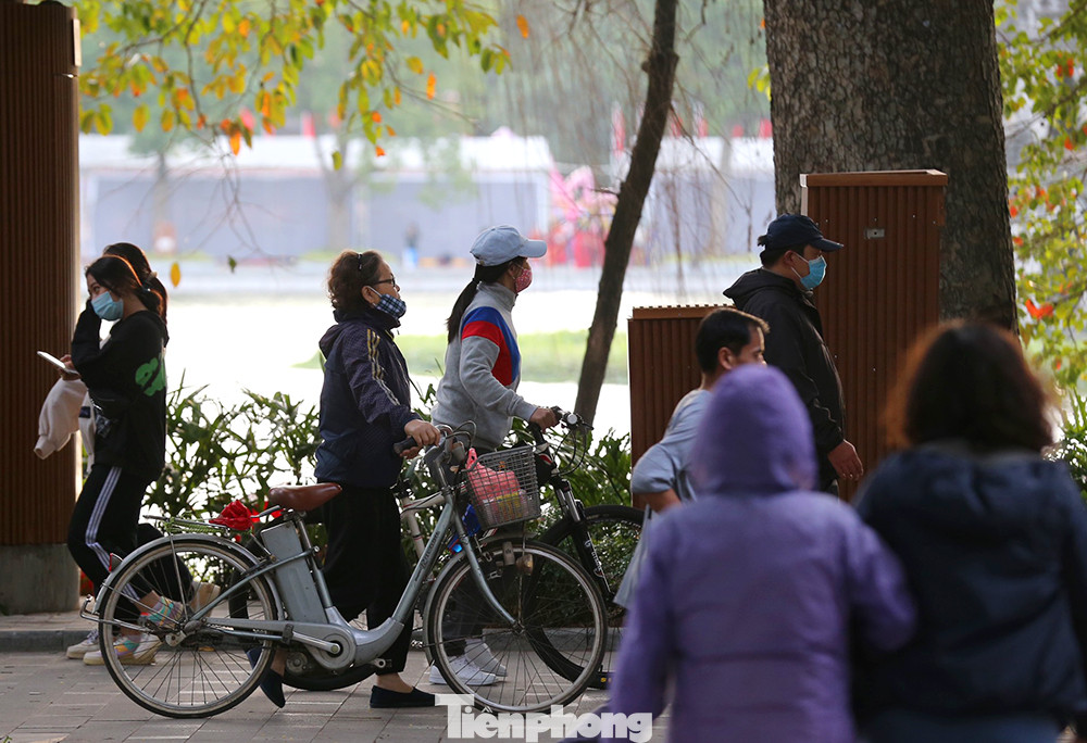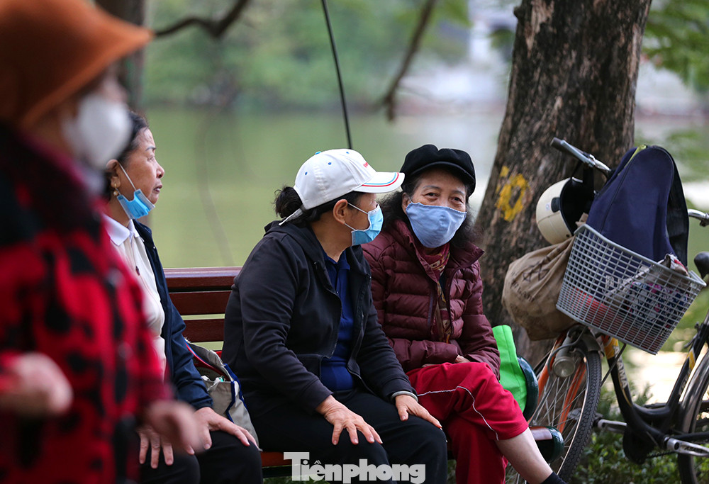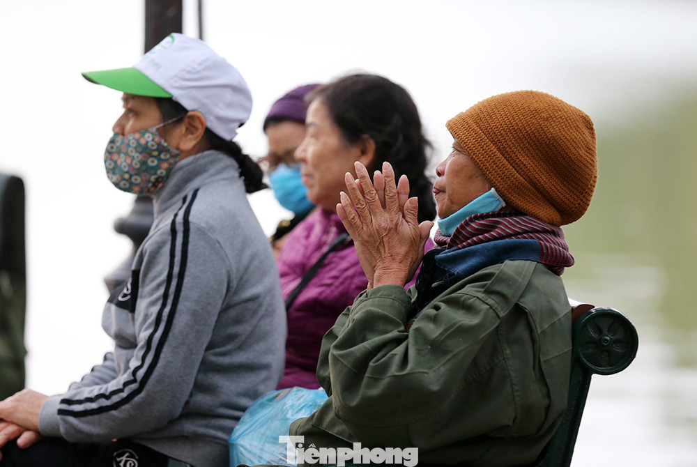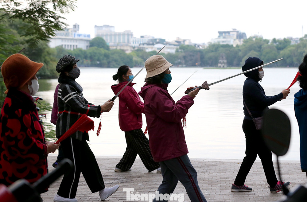 Nhiều người lớn tuổi tập thể dục thể thao trên bờ hồ phải mặc thêm áo ấm giữ nhiệt