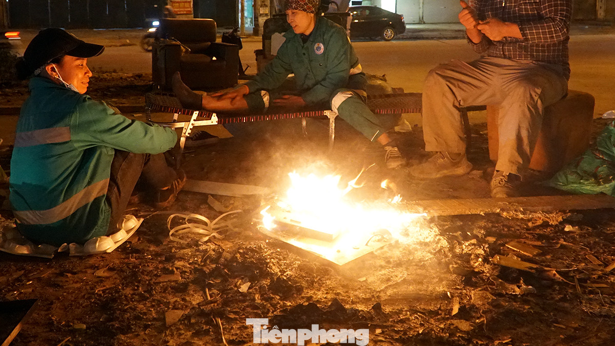 Theo ghi nhận của PV Tiền Phong trong đêm 17/12, đi dọc những tuyến đường như ngã tư Giải Phóng - Kim Liên, Đường Láng, Xã Đàn, Tây Sơn... cứ cách một đoạn người dân lại nhóm lên một đống lửa ven đường để sưởi ấm.