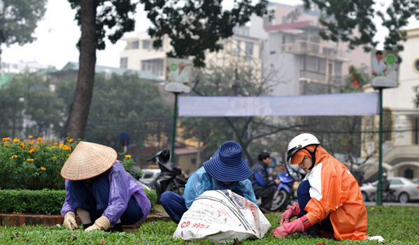 Trời mưa ẩm kéo dài cũng khiến đội ngũ chăm sóc cây xanh, thảm cỏ của Hà Nội phải làm việc vất vả hơn.