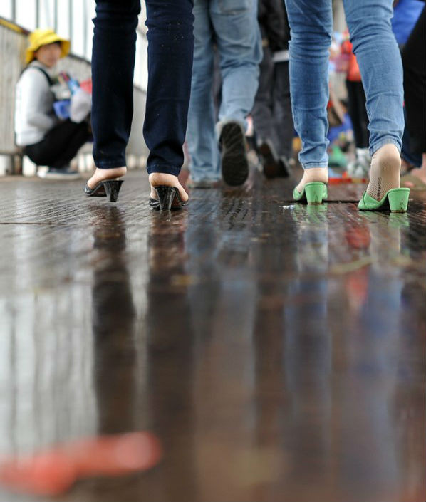 Các cầu vượt dành cho người đi bộ trên đường Giải Phóng (đoạn qua cổng Bệnh viện Bạch Mai) có lượng người qua lại đông nên lúc nào mặt cầu cũng trơn ướt, mọi người đi qua đây khá chậm để tránh bị ngã.