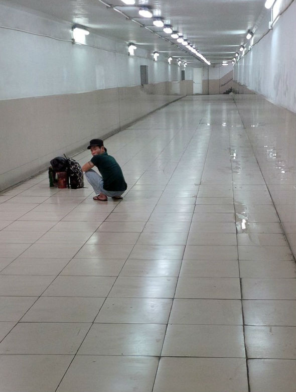 Hầm dành cho người đi bộ qua hầm Kim Liên gần như không có người qua lại do thời tiết ẩm nên mặt sàn rất trơn và khó đi.