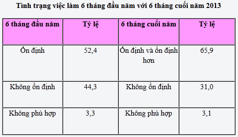 Tình trạng việc làm của người lao động tại Hà Nội trong 6 tháng cuối năm có sự chuyển biến tích cực. Tỷ lệ việc làm không ổn định trong nửa cuối giảm từ 44,3% xuống còn 31%, cùng với đó là sự gia tăng việc làm ổn định, từ 52,4% 6 tháng tháng đầu năm tăng lên 65,9% trong 6 tháng cuối năm 2013.