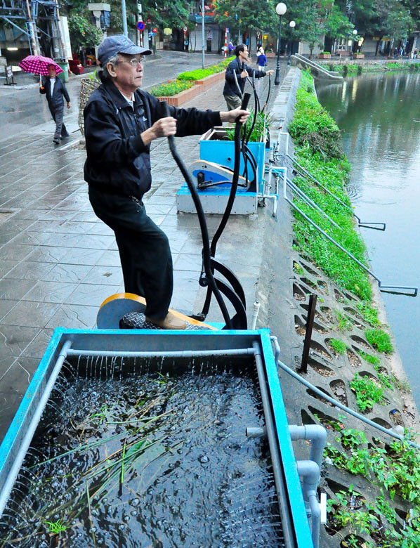 Những chiếc máy tập thể dục lọc nước ven hồ Ngọc Khánh (Hà Nội) thu hút được nhiều người dân tập luyện.