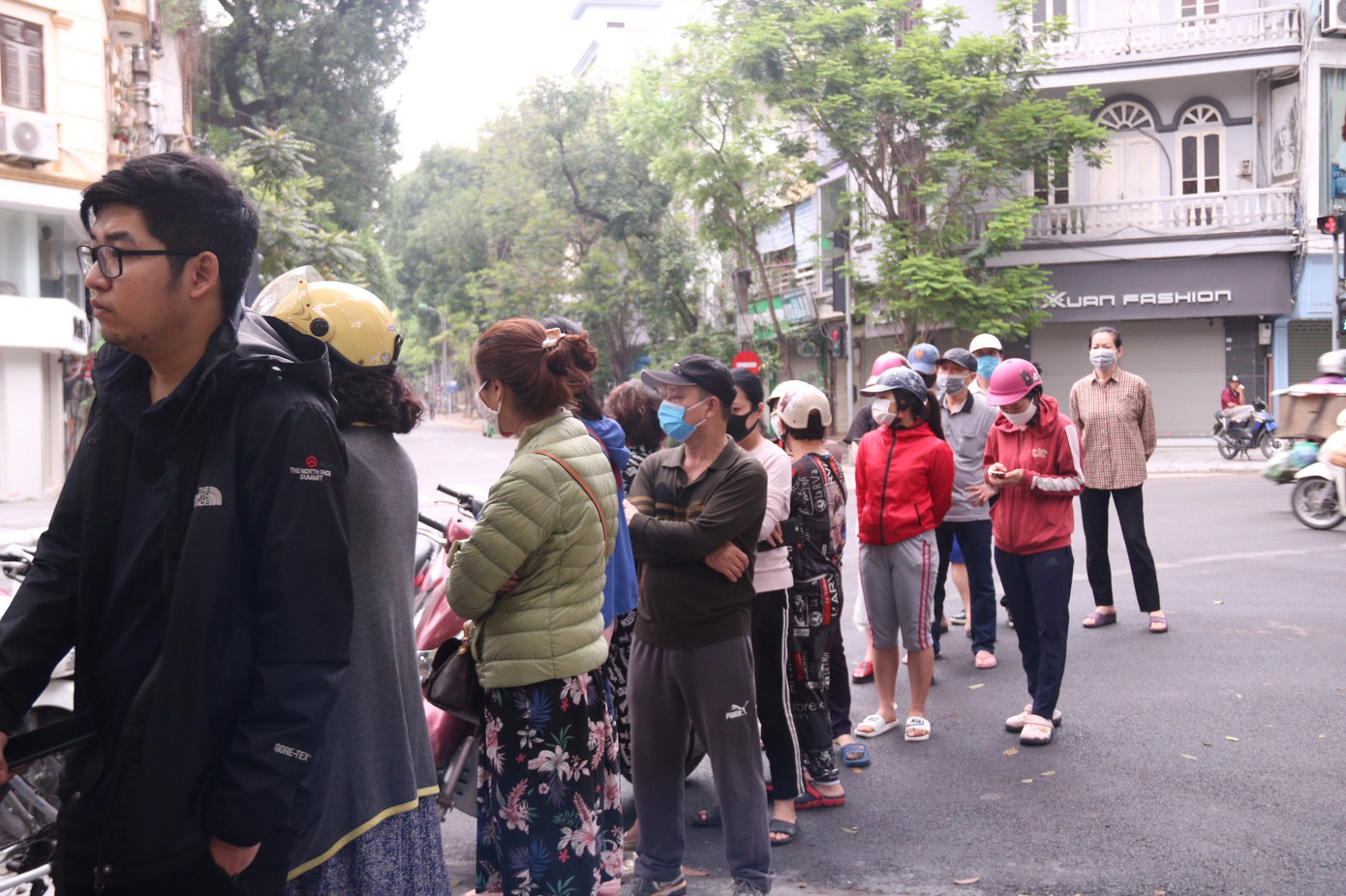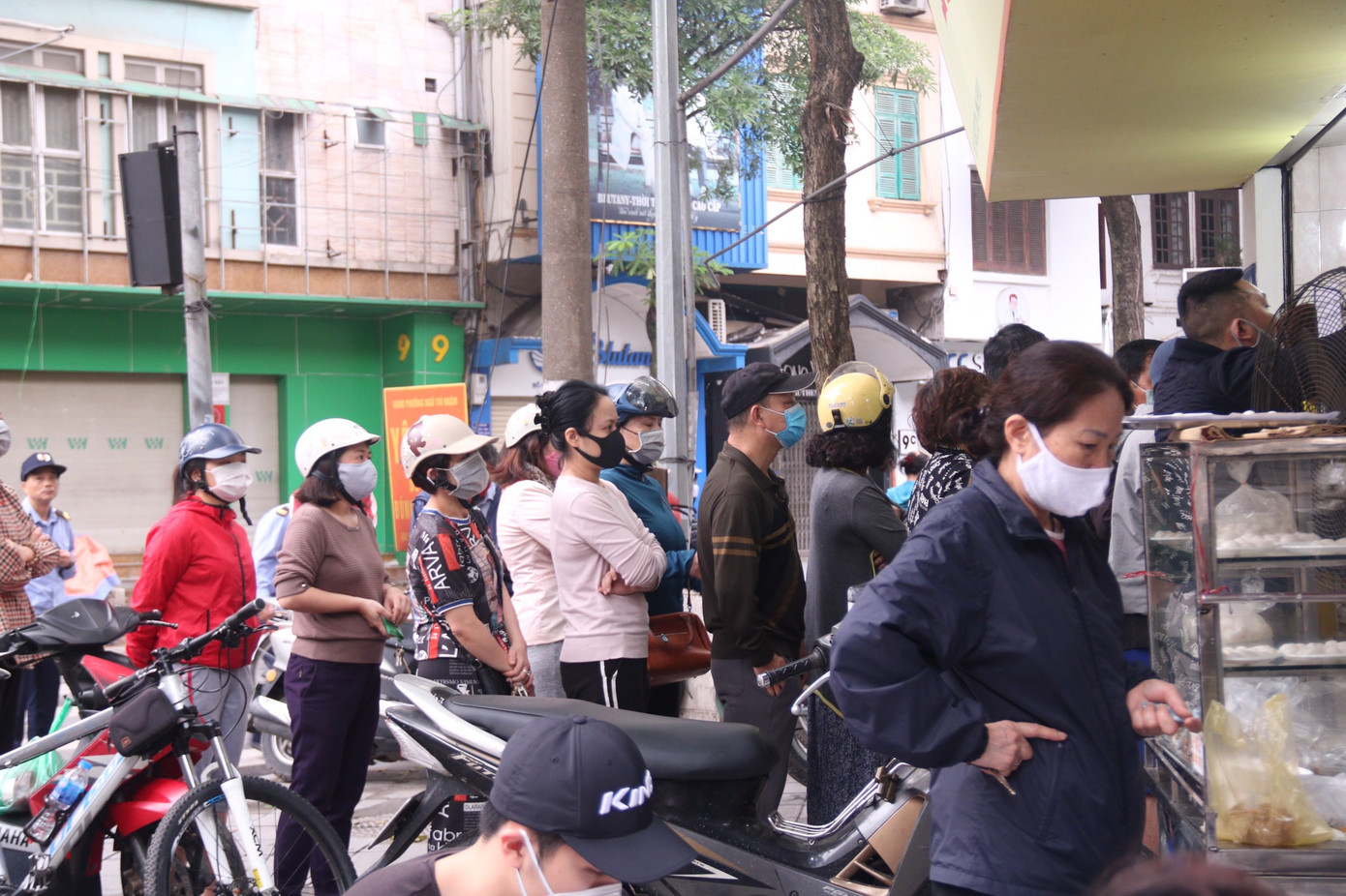 Hàng dài người xếp hàng chờ mua bánh trôi, bánh chay tại một cửa hàng góc phố Ngô Thì Nhậm (Hà Nội)