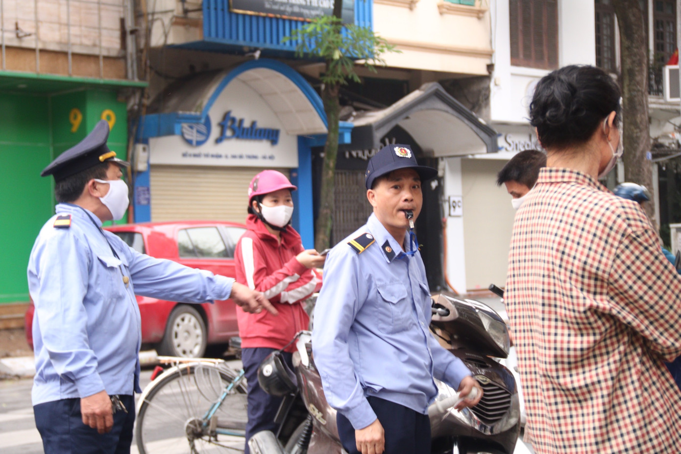 Lượng khách mua đông khiến đoạn phố trước cửa hàng lộn xộn xe máy tràn xuống lòng đường. Lực lượng trật tự phải có mặt từ sớm để đảm bảo không xảy ra tình trạng lộn xộn