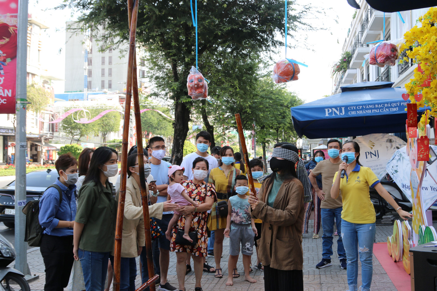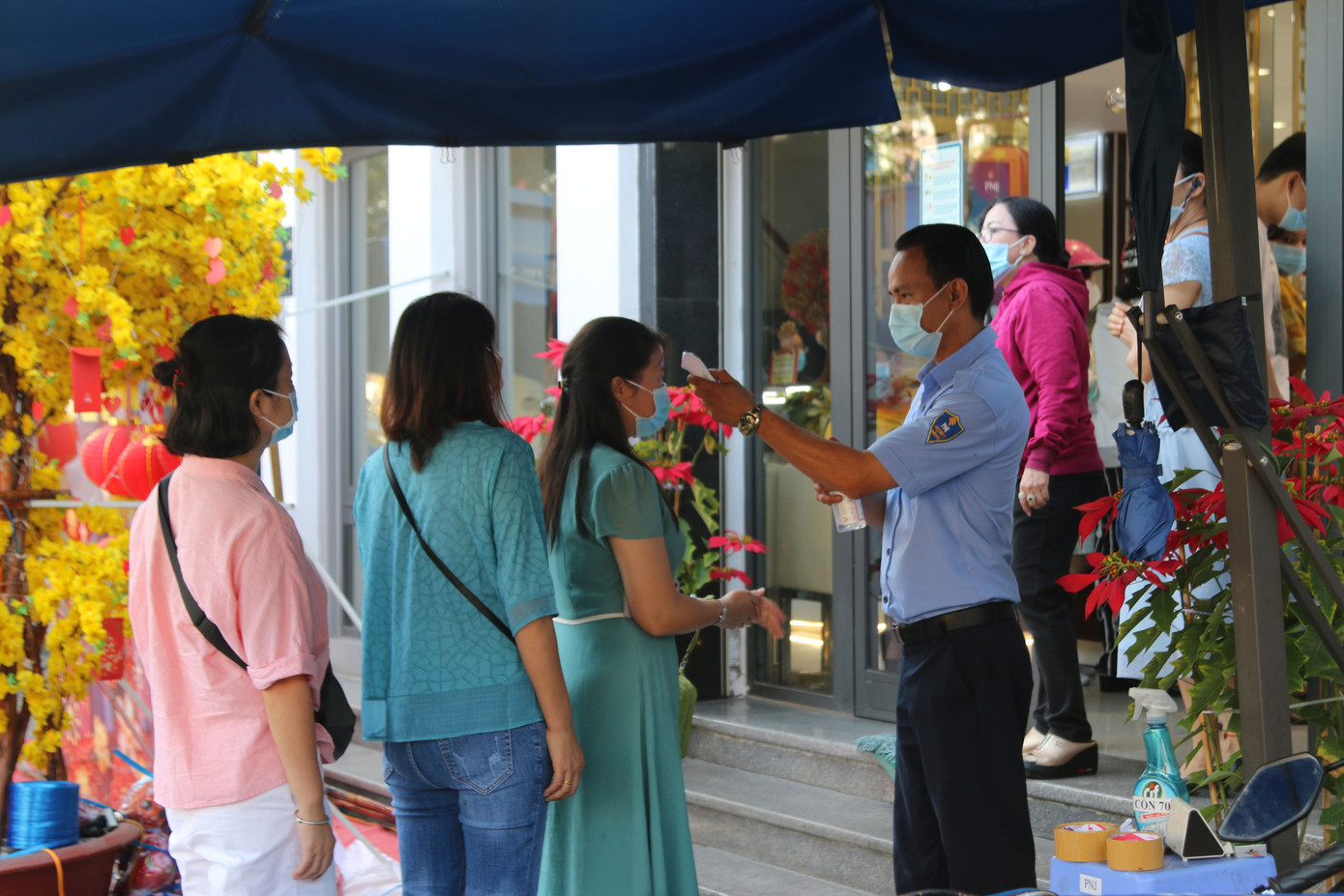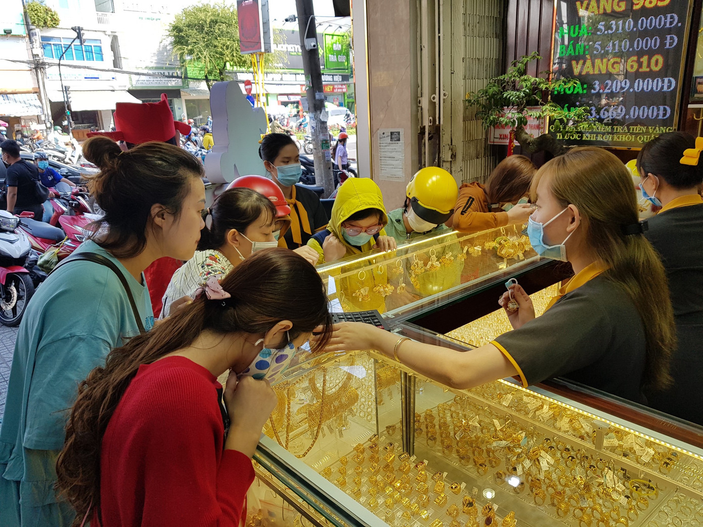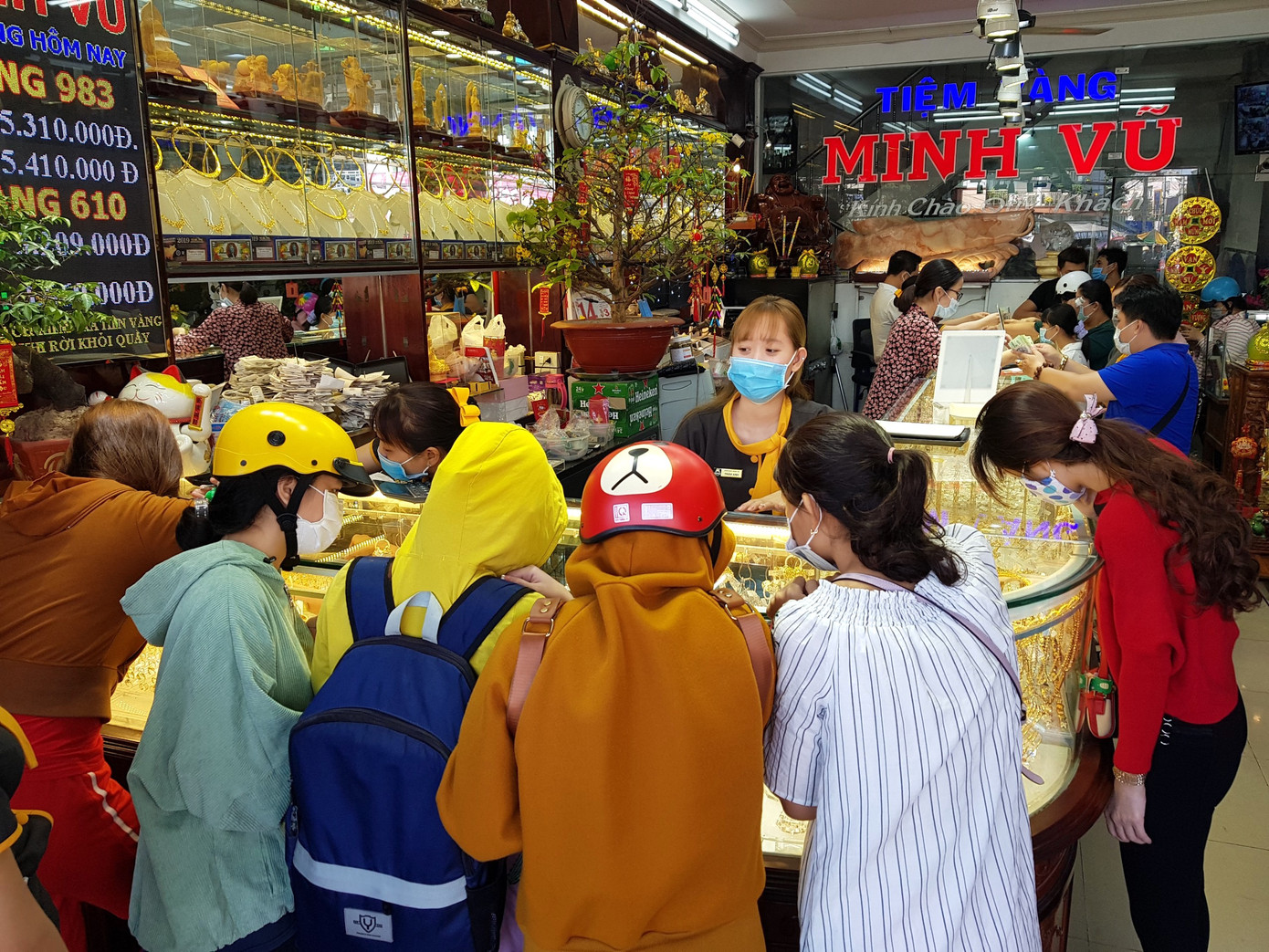 Lượng khách mua nhiều vào thời điểm từ 7h sáng đến 10 giờ ngày hôm nay. Tại Cần Thơ, theo ghi nhận của phóng viên, tại các cửa hàng vàng ở trung tâm thành phố Cần Thơ sáng nay đông khách nhưng không phải dân chen chân như những năm trước. Khách đến mua vàng đều mang khẩu trang kín mít.