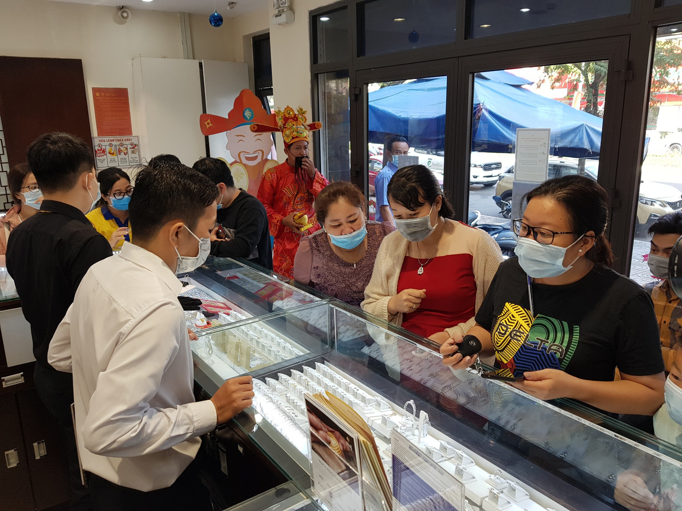 Ngày vía Thần Tài mùng 10 tháng giêng năm nay rơi vào đúng chủ nhật 21/2 nên rất đông khách hàng đến mua vàng cầu may dù dịch COVID-19 đang có những diễn biến phức tạp.