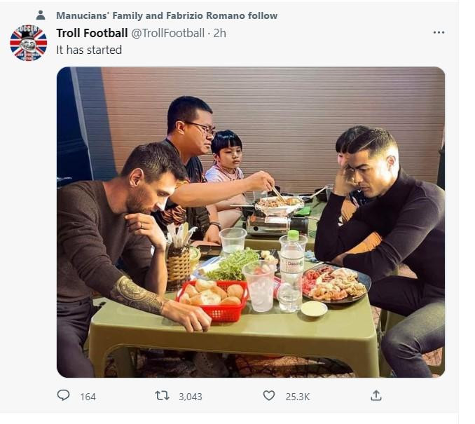 Cụ thể, một người hâm mộ Việt Nam đã dùng phần mềm photoshop để đưa Messi và Ronaldo đến Việt Nam. Bàn cờ vua được thay thế bằng bàn.. nhậu đậm chất Việt Nam, với chiếc bàn nhựa, bánh mì, ly nhựa và chai nước không lẫn vào đâu được. Bức ảnh chế này được đăng tải trên Troll Football - cộng đồng ảnh hài hước bóng đá có hơn 1 triệu người theo dõi. Hàng chục nghìn lượt tương tác đều tỏ ra thích thú với hình ảnh đời thường của hai siêu sao.