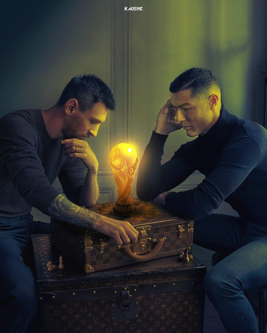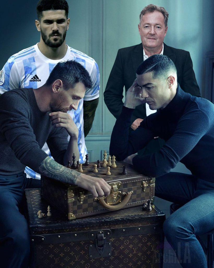 Cristiano Ronaldo và Lionel Messi cùng hợp tác trong chiến dịch quảng cáo mới nhất của thương hiệu thời trang Louis Vuitton. Cả hai cầu thủ đăng tải trên trang cá nhân hình ảnh chụp bên bàn cờ vua. Ronaldo mặc chiếc áo len cao cổ màu xanh, chăm chú theo dõi nước đi tiếp theo của Messi - người mặc chiếc áo len cổ tròn với tay áo xắn lên để lộ hình xăm.