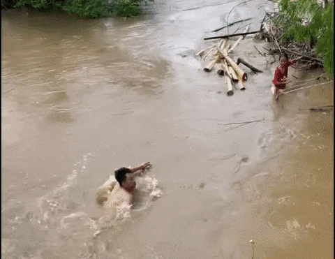 Trong đoạn clip, nam thanh niên mình trần khi thấy bé gái đang cố gắng bám víu vào cành tre giữa dòng nước xiết, đã vội nhảy xuống cứu giúp. Khi tiếp cận được, anh cõng đứa trẻ trên lưng rồi đưa vào bờ.
