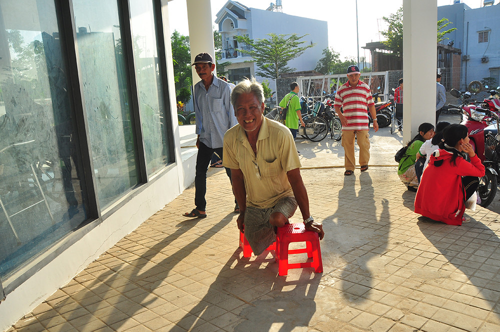 Người khuyết tật nhận quà Tại buổi nhận quà, có rất nhiều người khuyết tật sống bằng nghề bán vé số, có người hay tin đã nghỉ hẳn 1 ngày để đến nhận quà, có người tranh thủ đến nhận xong rồi đi bán vé số tiếp. Điển hình như anh Huỳnh Văn Mốm, cùng vợ đều bị khuyết tật 2 chân. "Vợ chồng đi lại khó khăn, sợ lãnh vé số rồi mà vào đây nhận quà nữa sẽ trễ bán không hết thì khổ nên cả hai nghỉ bán 1 ngày để nhận quà rồi mai bán tiếp", anh Mốm nói.