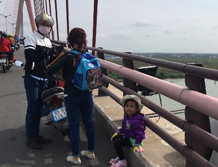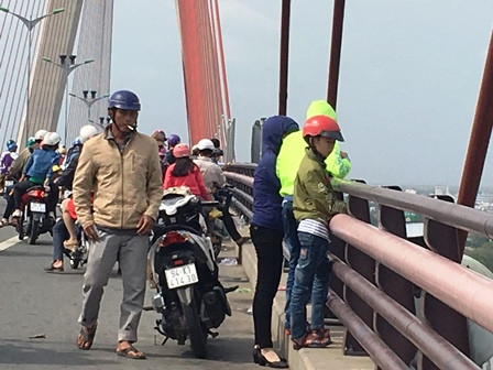 Do nhiều người dừng lại trên cầu nên các phương tiện xe gắn máy qua cầu bắc buộc phải lấn sang làn đường của xe ô tô rất nguy hiểm.